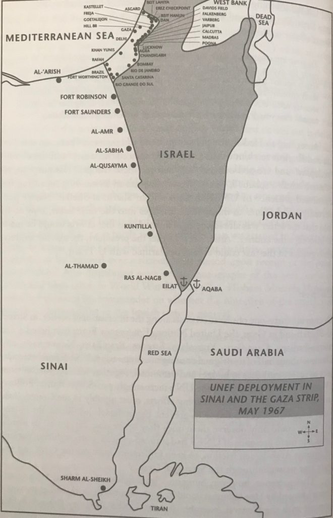 وكانت البرامج المعدة خصيصا للنيّل من عبد الناصر تكرر وتعيد أن الزعيم المصري وجيشه يختبئان وراء قوات الطوارئ الدولية المرابطة في نقاط محددة حول القناة وفي شرم الشيخ جنوبا، وعلى حدود الهدنة وداخل قطاع غزة الفلسطيني الذي تديره مصر منذ ١٩٤٨، كانت هذه القوات الدولية، التي لم يزِد قوامها عن ٤٠٠ر٣ جندي من عدة دول، منتشرة على الجانب المصري فقط من الحدود مع إسرائيل منذ أواخر ١٩٥٦ في إطار ترتيبات إنهاء حرب السويس أو ما عُرف في مصر بالعدوان الثلاثي (الفرنسي الإنجليزي الإسرائيلي)، وتضمنت الترتيبات منح إسرائيل حق العبور الآمن في مضايق تيران نحو ميناء إيلات حيث وصلت بانتظام شحنات نفط إيرانية وقسما من تجارة اسرائيل استيرادا وتصديرا. وفي عامي ١٩٦٥-١٩٦٦، رست في ميناء إيلات ٥٠٠ سفينة استوردت ٥٤ ألف طن وصدرت ٢٠٧ ألف طن سلع مختلفة.