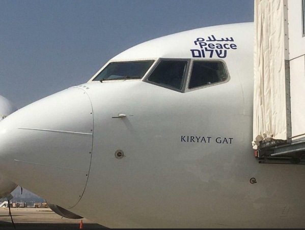٣١ اغسطس — قام عمال اسرائيليون بكتابة شعارات السلام بالعربية والانجليزية والعبرية على جسد الطائرة البوينج ٧٣٧ التابعة لشركة العال لتقوم بأول رحلة مدنية علنية مباشرة بين اسرائيل والامارات اليوم، وبذلك تدشن بداية تطبيع العلاقات بين البلدين. اسفل الشعارات يوجد اسم الطائرة وهو كريات جات وهي بلدة اسرائيلية قامت في اوائل الخمسينيات وتوسعت على انقاض قريتين فلسطينتين هما عراق المنشية والفالوجة على بعد ٣٠ كيلومتر شمال شرق قطاع غزة.