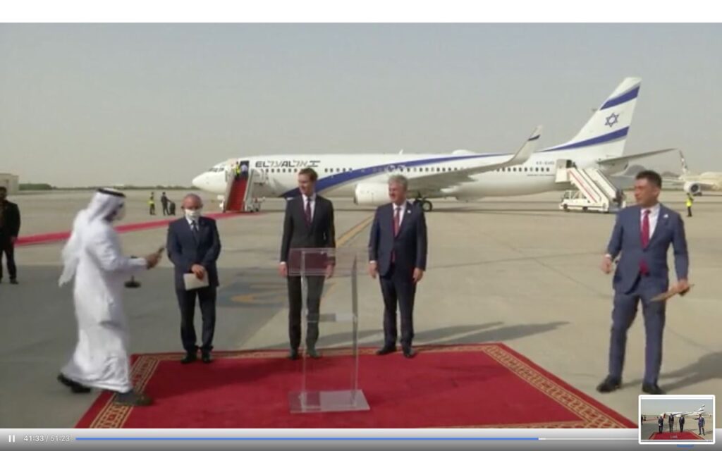 الرحلة ثلاث ساعات وعشرون دقيقة وحلقت الطائرة فوق السعودية التي سمحت بالرحلة على الأغلب بعد طلب امريكي حيث يجلس على متن الطائرة السيد جاريد كوشنر، زوج بنت الرئيس طرمب ومستشاره لشؤون الشرق الاوسط. الطائرة تقل ايضا وفد امني واقتصادي وسياسي. وزير المالية الاسرائيلي توقع ان يرتفع التبادل التجاري القائم بين البلدين الى نحو ملياري دولار ثم يقفز بسرعة الى ٥ر٦ مليار دولار ويركز على مجالات الاستثمارات المالية والتجارة والسياحة والصحة.