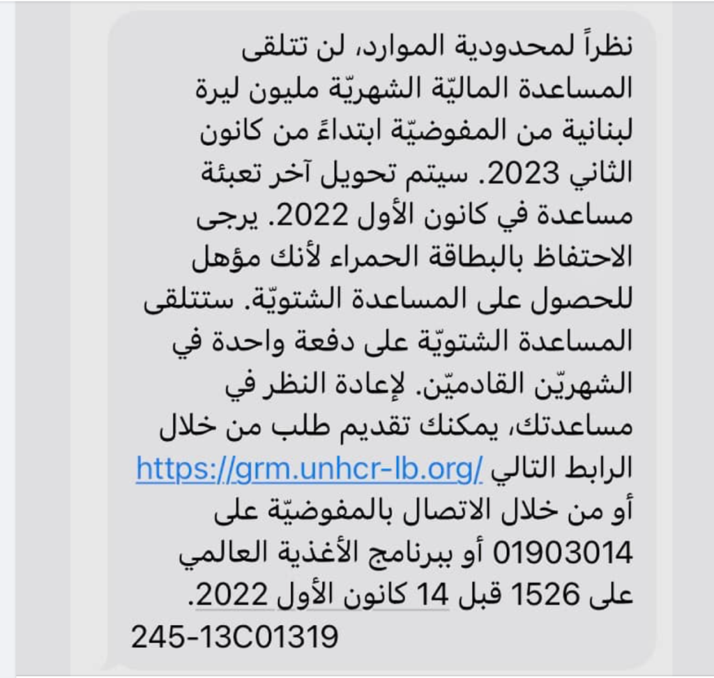 15 نوفمبر 2022 — وصلتني الرسالة التالية. اعرف انها وصلتني لان الشخص الذي كان يمتلك شريحة الهاتف قبل ان اشتريها لهذا الاسبوع لاجىء ربما من سوريا، وتوقف عن استعمالها لأنه ربما عاجز عن دفع ثمن تجديد الخط، او لان حظه افضل فتمكن من الهجرة، شرعيا او غير نظاميا، او لان حظه اسوأ وواجه مصيرا مظلما.