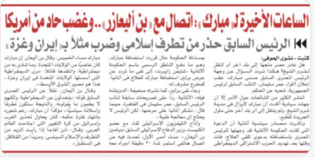 ١٣ فبراير — مبارك، الله يحاسبه، كان جاهل أو مغرض أو الاتنين في الأغلب. قبل ما يتعزل بعدة ساعات عمل المكالمة الوحيدة التي فضحها حلفاؤه المقربون، وكانت لصديقه عضو الكنيست والوزير السابق بنيامين اليعازر. والسياسي الاسرائيلي مكدبش خبر وراح نقل الكلام للتلفزيون الاسرائيلي وقال ان المكالمة استمرت ٢٠ دقيقة. مبارك شكله شتم الامريكان جامد وفقا لبن اليعازر وقال انهم خربوا الدنيا في موضوع الديمقراطية بدليل دعمهم للديمقراطية في ايران وفي غزة. أمريكا عملت ديمقراطية في إيران يا جاهل يا جهول! طبعا هو كلم اليعازر عشان الاسرائيليين يساعدوه في واشنطن لكن الوقت كان اتأخر ولو ان النظام الاسرائيلي استمر داعما للنظام و “الاستقرار” المصري، لكن عصر مبارك كان قد انتهى!