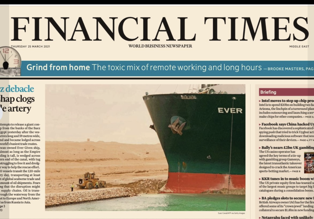 ٢٥ مارس – وضع بعض الافراد حسني النية صورة نشرتها صحيفة فاينانشيال تايمز في صدر صفحتها الاولى لبلدوزر مصري شجاع يحاول تحريك تلك السفينة الجانحة بعشرين الف حاوية مما عطل الملاحة في قناة السويس منذ يومين. هذه يا أخوة صحيفة بريطانية أي انها تأتي من بلد صاحب تاريخ استعماري عريق احتل بلدنا من اجل السيطرة على هذه القناة التي هي هدية الخديوى اسماعيل وابنه توفيق للعالم. لا تجعلوا القوى الاستعمارية التي تتحدث عن “كارثة السويس .. حادث مؤسف يضرب شريان التجارة” تفت في عضدكم او تجعلكم تتشككون في اننا نغطرش باي شكل على ابعاد المشكلة التي عرفنا عنها وعن تطوراتها من الصحافة الاجنبية المغرضة. انها انجلترا ايتها الاخوة والاخوات التي هاجمت بلادنا في سنة ١٩٥٦ بعد أن أممنا القناة. أعلم ان هذا جرى منذ ٦٥ عاما ولكن الاطماع الاستعمارية لن تموت ابدا ويجب ان نظل واعين لها.