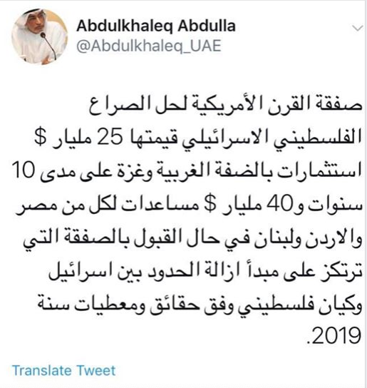 صفقة القرن الامريكية التي يسوقها جاريد كوشنر في الخليج حاليا قد تشمل تبرع السعودية والإمارات اساسا ومعهما دول أوروبية بحوالي ٦٥ مليار دولار على عدة سنوات لتمويل توطين اللاجئين الفلسطينيين في الشتات (خاصة لبنان والأردن) ولتمويل مشاريع اقتصادية للفلسطينيين وفي إسرائيل والدول العربية المجاورة ومنح إسرائيل حق سيادة على القدس وتقاسم حق إدارة الأماكن المقدسة مع الفلسطينيين وإقامة دولة فلسطينية فيما تبقى من أراض متفرقة في الضفة وغزة منزوعة السلاح الثقيل وترتيبات أمنية للحدود بين اسرائيل والدول العربية المجاورة (زي معبر رفح كدة وجسر الملك حسين) … الخطة حطها الشاب الجرىء كوشنر جوز إيفانا بنت ترامب ومساعده الرئيسي جاسون جرينبلات اللي كان محامي عقارات عند ترامب ١٢ سنة قبل ما يعينه مسؤول ملف عملية السلام في الشرق الأوسط من سنتين. ومصدر امريكاني بيقول ٨٠٪ من الخطة اقتصادي والباقي حول الارض واللاجئين والقدس على ان تبقى القدس عاصمة اسرائيل وتُغلق اونروا وتُصفى قضية اللاجئين الفلسطينيين وتُطبع العلاقات مع الدول العربية الخليجية وتُوضع ترتيبات أمنية اقليمية.. (مصادر أمريكية واسرائيلية وخليجية منها تويتة المحلل المقرب للنظام الإماراتي في الصورة تحت).