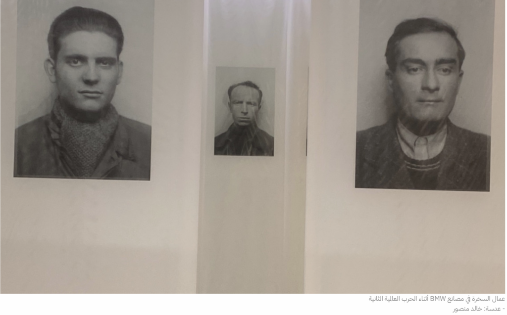 اختبأ معرض المحرقة الصغير نسبيًا خلف لافتات معلقة رأسيًا من السقف جذبت أولها انتباهي بلونيها الأبيض والأسود، حيث كان مكتوبًا عليها بخطٍّ كبير “الكرامة الإنسانية مقدسة”، وبخط أصغر كثيرًا تحت ذلك الشعار جاء أن مصدره المادة الأولى من الدستور الألماني. وأضافت اللافتة المعلقة على الجانب الآخر لمدخل الصالة أن BMW تعترف بما اقترفته في تاريخها ولذا فإن المعرض في هذه الصالة يتناول تاريخ السخرة في مصانع الشركة أيام حكم الاشتراكية الوطنية (وهو الاسم الرسمي للحزب النازي) لضمان “ألا يتكرر ذلك مرة أخرى”.