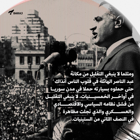 ومثلما لا ينبغي التقليل من مكانة عبد الناصر الهائلة في قلوب الناس آنذاك حتى حملوه بسيارته حملاً في مدن سوريا في أواخر الخمسينات، لا ينبغي التقليل من فشل نظامه السياسي والاقتصادي والعسكري والذي تجلت مظاهره في النصف الثاني من الستينات.